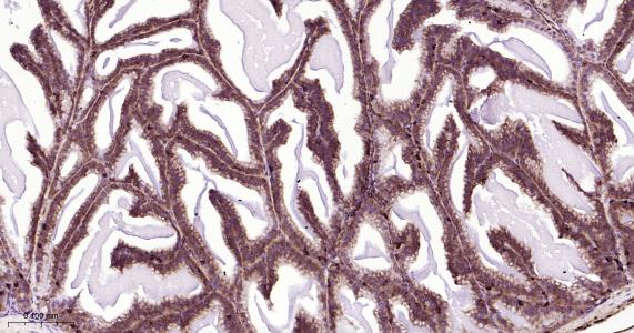 Paraformaldehyde-fixed, paraffin embedded Mouse Prostate; Antigen retrieval by boiling in sodium citrate buffer (pH6.0) for 15 min; Antibody incubation with CRMP2 Monoclonal Antibody, Unconjugated(bsm-61800R) at 1:200 overnight at 4°C, followed by conjugation to the bs-0295G-HRP and DAB (C-0010) staining.