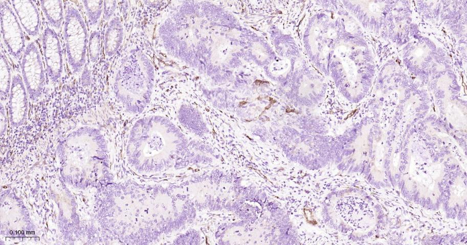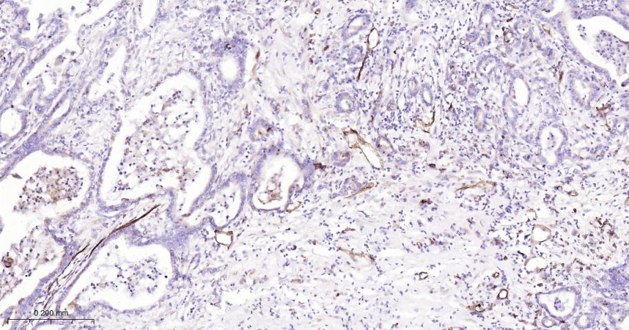 Paraformaldehyde-fixed, paraffin embedded Human Colon Cancer; Antigen retrieval by boiling in sodium citrate buffer (pH6.0) for 15 min; The section was incubated with PODXL Monoclonal Antibody, Unconjugated (bsm-61807R) at 1:200 overnight at 4°C, followed by conjugation to the bs-0295G-HRP and DAB (C-0010) staining.
