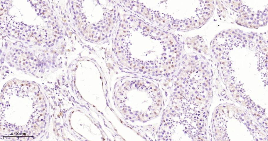 Paraformaldehyde-fixed, paraffin embedded Human Testicles; Antigen retrieval by boiling in sodium citrate buffer (pH6.0) for 15 min; Antibody incubation with TFE3 Monoclonal Antibody, Unconjugated(bsm-61810R) at 1:200 overnight at 4°C, followed by conjugation to the bs-0295G-HRP and DAB (C-0010) staining.