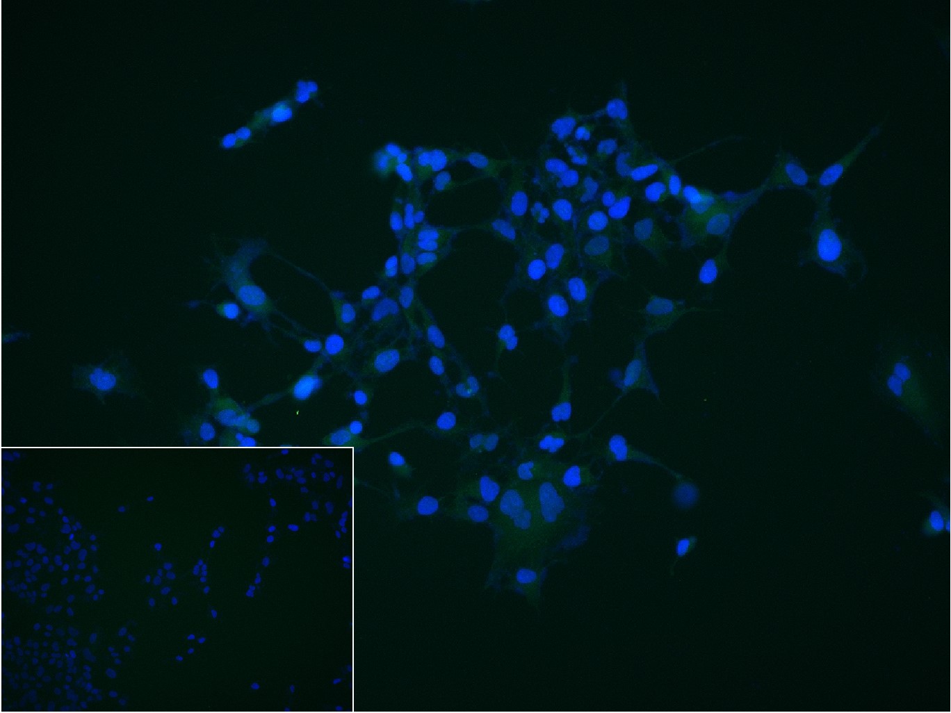 4% Paraformaldehyde-fixed A673 (H) cell; Triton X-100 at r.t. for 20 min; Antibody incubation with (Nkx2.2) monoclonal Antibody, unconjugated (bsm-61814R) 1:100, 90 min at 37°C; followed by conjugated Goat Anti-Rabbit IgG antibody (green, bs-40295G-FITC) at 37°C for 90 min, DAPI (blue, C02-04002) was used to stain the cell nuclei. PBS instead of the primary antibody was used as the blank control.