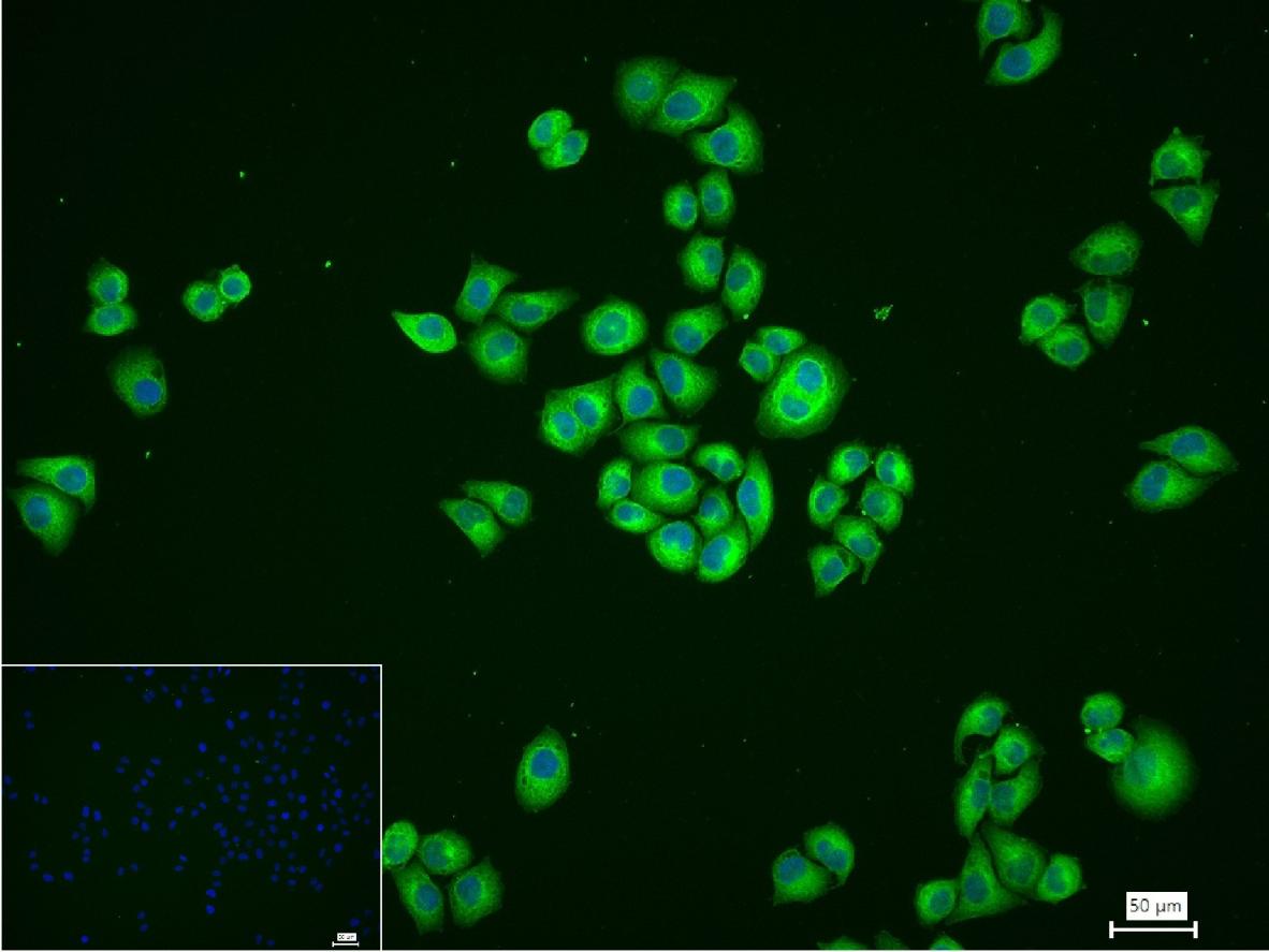 4% Paraformaldehyde-fixed Hela (H) cell; Triton X-100 at r.t. for 20 min; Antibody incubation with (EIF2AK4/GCN2) monoclonal Antibody, unconjugated (bsm-61825R) 1:100, 90 min at 37°C; followed by conjugated Goat Anti-Rabbit IgG antibody (green, bs-40295G-FITC) at 37°C for 90 min, DAPI (blue, C02-04002) was used to stain the cell nuclei. PBS instead of the primary antibody was used as the blank control.