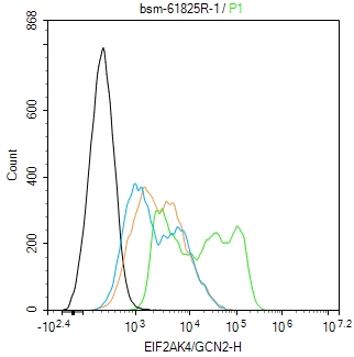 The Hela (H) cells were fixed with 4% PFA (10 min at r.t.) and then permeabilized with 90% ice-cold methanol for 20 min at -20℃,the cells then were incubated in 5%BSA to block non-specific protein-protein interactions (30 min at r.t.).Primary Antibody (green):Rabbit Anti-EIF2AK4/GCN2 antibody (bsm-61825R): 1 μg/10^6 cells; Secondary Antibody (white blue): Goat anti-Rabbit IgG-FITC (bs-40295G-FITC): 1 μg/test. Isotype Control (orange): Rabbit IgG (bs-0295P). Blank control (black): PBS. Acquisition of 20,000 events was performed.