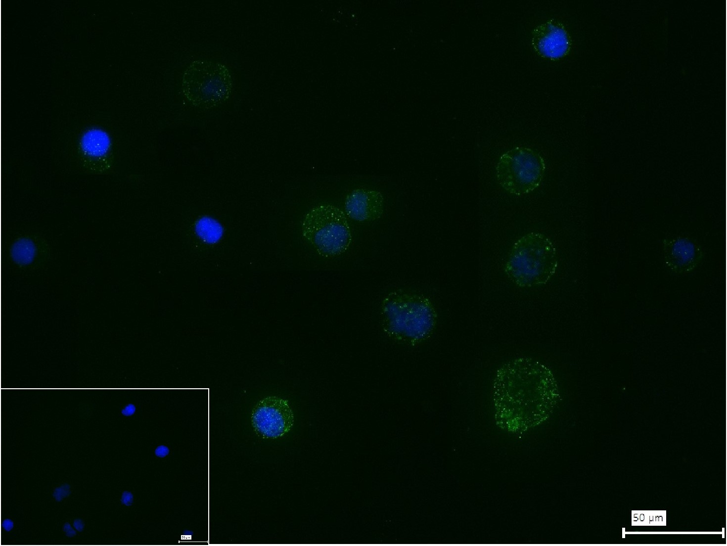 4% Paraformaldehyde-fixed Jurkat (H) cell; Antibody incubation with (PSGL-1/CD162) monoclonal Antibody, unconjugated (bsm-61840R) 1:100, 90 min at 37°C; followed by conjugated Goat Anti-Rabbit IgG antibody (green, bs-40295G-FITC) at 37°C for 90 min, DAPI (blue, C02-04002) was used to stain the cell nuclei. PBS instead of the primary antibody was used as the blank control.