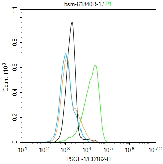The Jurkat(H) cells were incubated in 5%BSA to block non-specific protein-protein interactions (30 min at r.t.). Primary Antibody (green): Rabbit Anti-PSGL-1/CD162 antibody (bsm-61840R): 1 μg/10^6 cells; Secondary Antibody (white blue): Goat anti-Rabbit IgG-FITC (bs-40295G-FITC): 1 μg/test. Isotype Control (orange): Rabbit IgG (bs-0295P). Blank control (black): PBS. Acquisition of 20,000 events was performed.