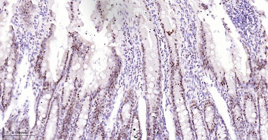 Paraformaldehyde-fixed, paraffin embedded Human Small Intestine; Antigen retrieval by boiling in sodium citrate buffer (pH6.0) for 15 min; The section was incubated with SF3B1 Monoclonal Antibody, Unconjugated (bsm-61871R) at 1:200 overnight at 4°C, followed by conjugation to the bs-0295G-HRP and DAB (C-0010) staining.