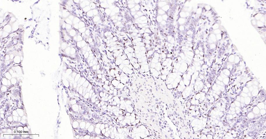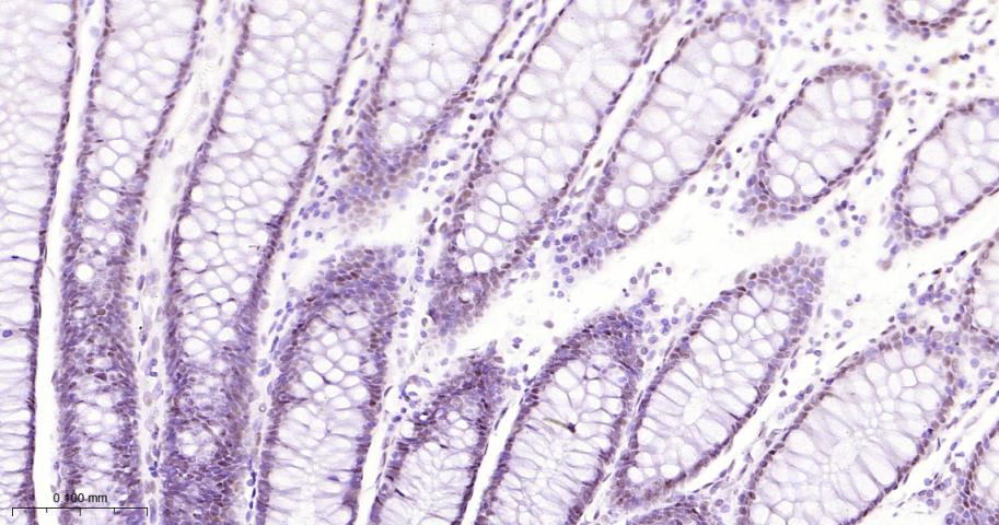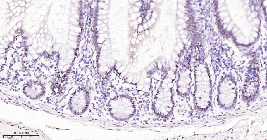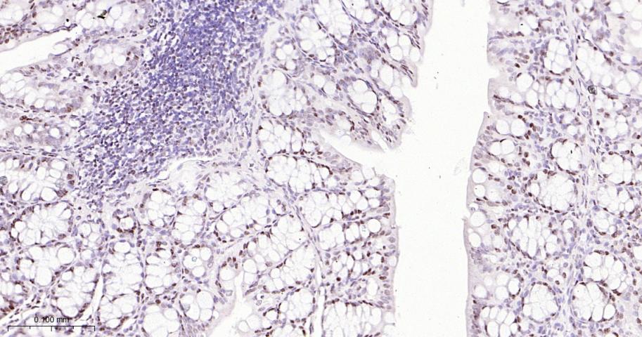 Paraformaldehyde-fixed, paraffin embedded Mouse Colon; Antigen retrieval by boiling in sodium citrate buffer (pH6.0) for 15 min; The section was incubated with SF3B1 Monoclonal Antibody, Unconjugated (bsm-61871R) at 1:200 overnight at 4°C, followed by conjugation to the bs-0295G-HRP and DAB (C-0010) staining.