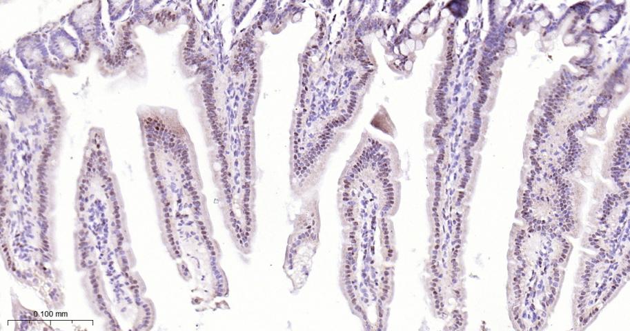 Paraformaldehyde-fixed, paraffin embedded Mouse Small Intestine; Antigen retrieval by boiling in sodium citrate buffer (pH6.0) for 15 min; The section was incubated with SF3B1 Monoclonal Antibody, Unconjugated (bsm-61871R) at 1:200 overnight at 4°C, followed by conjugation to the bs-0295G-HRP and DAB (C-0010) staining.
