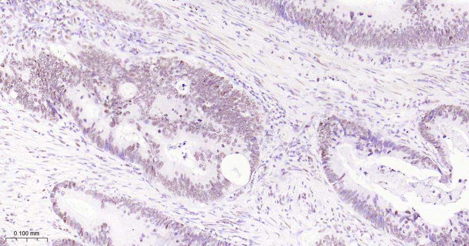 Paraformaldehyde-fixed, paraffin embedded Human Colon Cancer; Antigen retrieval by boiling in sodium citrate buffer (pH6.0) for 15 min; The section was incubated with SF3B1 Monoclonal Antibody, Unconjugated (bsm-61871R) at 1:200 overnight at 4°C, followed by conjugation to the bs-0295G-HRP and DAB (C-0010) staining.