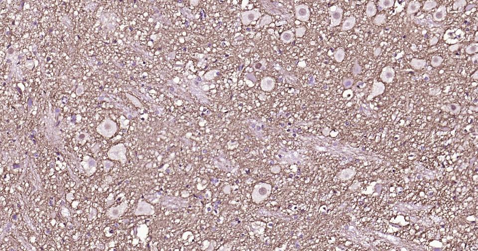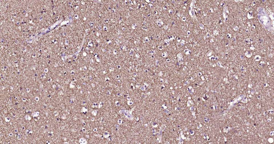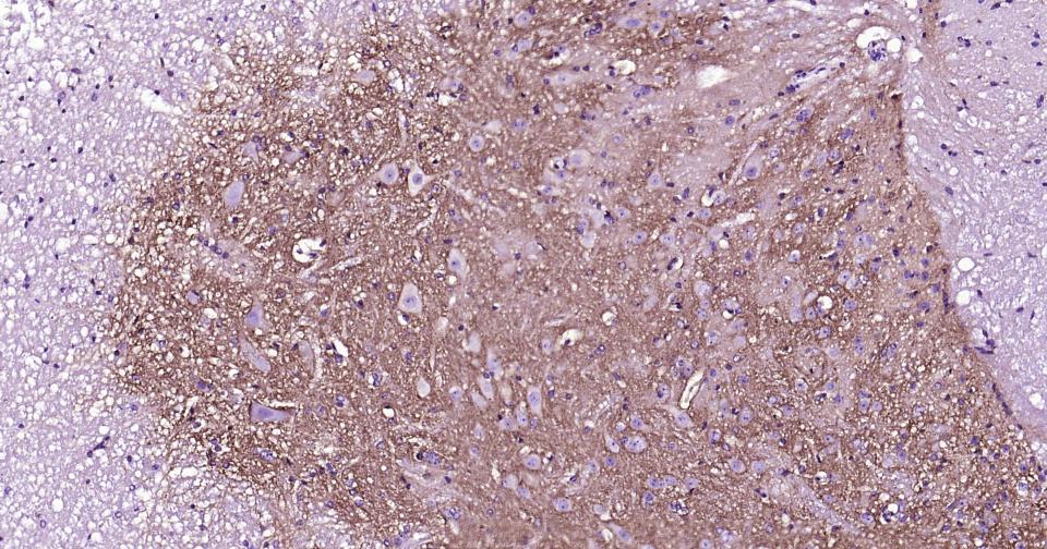 Paraformaldehyde-fixed, paraffin embedded Human Cerebrum; Antigen retrieval by boiling in sodium citrate buffer (pH6.0) for 15 min; Antibody incubation with GAT1?Monoclonal Antibody, Unconjugated(bsm-61879R) at 1:200 overnight at 4°C, followed by conjugation to the bs-0295G-HRP and DAB (C-0010) staining.