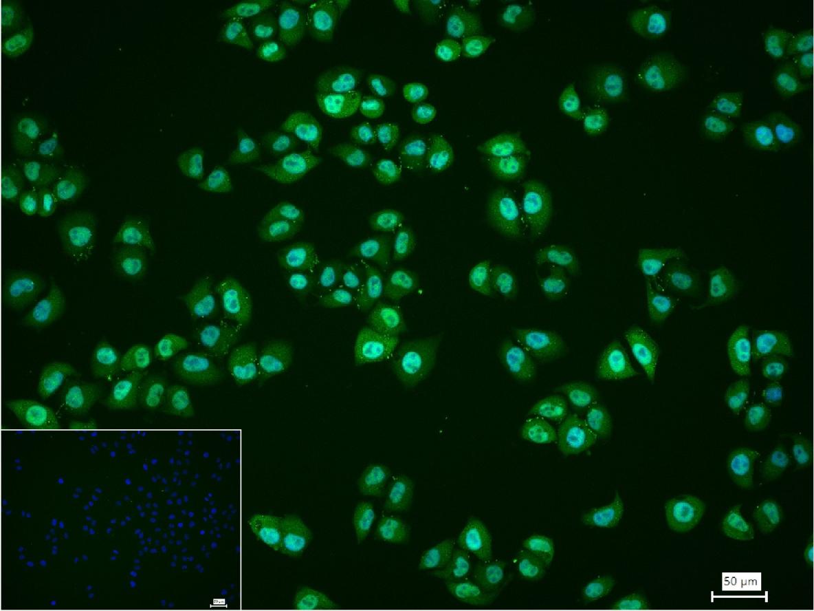 4% Paraformaldehyde-fixed Hela (H) cell; Triton X-100 at r.t. for 20 min; Antibody incubation with (eIF4A3) monoclonal Antibody, unconjugated (bsm-61883R) 1:100, 90 min at 37°C; followed by conjugated Goat Anti-Rabbit IgG antibody (green, bs-40295G-FITC) at 37°C for 90 min, DAPI (blue, C02-04002) was used to stain the cell nuclei. PBS instead of the primary antibody was used as the blank control.