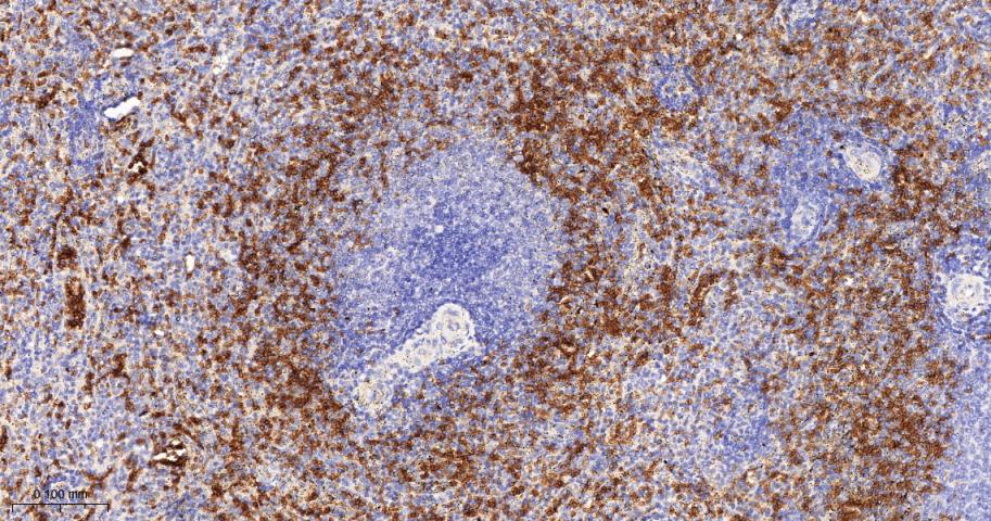 Paraformaldehyde-fixed, paraffin embedded Human Spleen; Antigen retrieval by boiling in sodium citrate buffer (pH6.0) for 15 min; The section was incubated with Band3 Monoclonal Antibody, Unconjugated (bsm-61887R) at 1:200 overnight at 4°C, followed by conjugation to the bs-0295G-HRP and DAB (C-0010) staining.