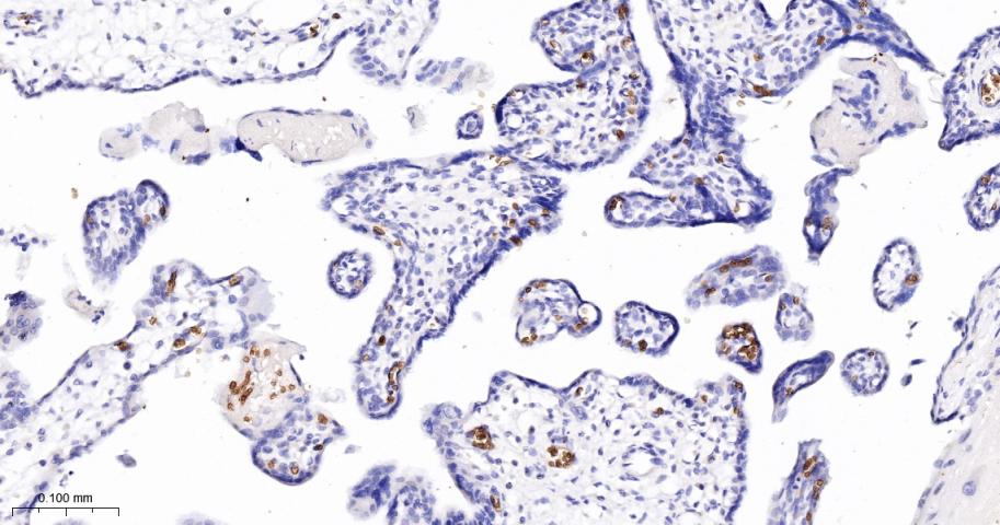 Paraformaldehyde-fixed, paraffin embedded Human Placenta; Antigen retrieval by boiling in sodium citrate buffer (pH6.0) for 15 min; The section was incubated with Band3 Monoclonal Antibody, Unconjugated (bsm-61887R) at 1:200 overnight at 4°C, followed by conjugation to the bs-0295G-HRP and DAB (C-0010) staining.