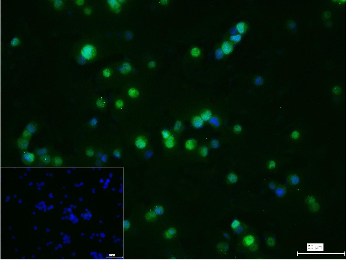 4% Paraformaldehyde-fixed Jurkat (H) cell; Triton X-100 at r.t. for 20 min; Antibody incubation with (HIF1AN) monoclonal Antibody, unconjugated (bsm-61905R) 1:100, 90 min at 37°C; followed by conjugated Goat Anti-Rabbit IgG antibody (green, bs-40295G-FITC) at 37°C for 90 min, DAPI (blue, C02-04002) was used to stain the cell nuclei. PBS instead of the primary antibody was used as the blank control.