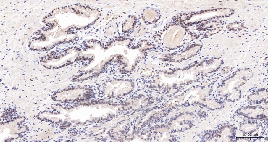 Paraformaldehyde-fixed, paraffin embedded Human Prostate; Antigen retrieval by boiling in sodium citrate buffer (pH6.0) for 15 min; The section was incubated with HIF1AN?Monoclonal Antibody, Unconjugated (bsm-61905R) at 1:200 overnight at 4°C, followed by conjugation to the bs-0295G-HRP and DAB (C-0010) staining.