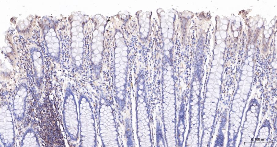 Paraformaldehyde-fixed, paraffin embedded Human Colon; Antigen retrieval by boiling in sodium citrate buffer (pH6.0) for 15 min; The section was incubated with HIF1AN?Monoclonal Antibody, Unconjugated (bsm-61905R) at 1:200 overnight at 4°C, followed by conjugation to the bs-0295G-HRP and DAB (C-0010) staining.