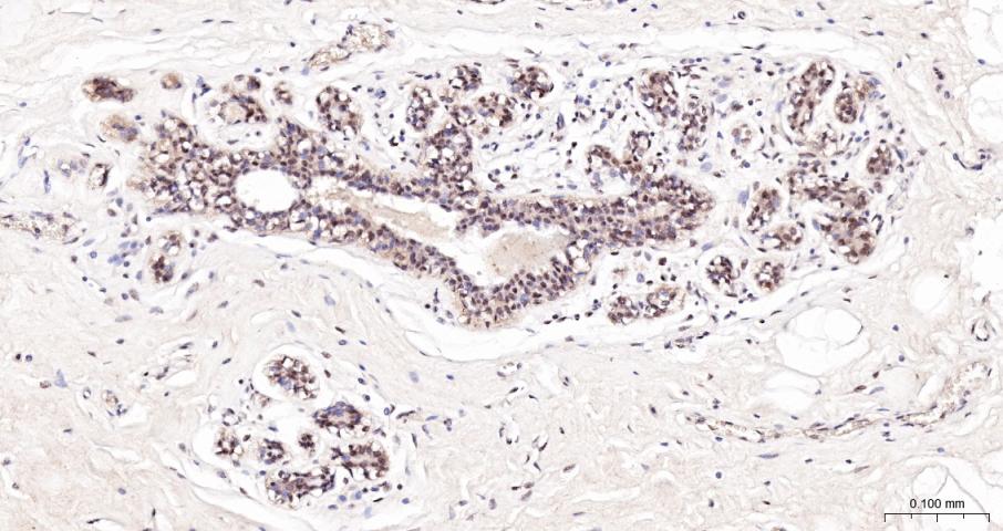 Paraformaldehyde-fixed, paraffin embedded Human Breast Cancer; Antigen retrieval by boiling in sodium citrate buffer (pH6.0) for 15 min; The section was incubated with HIF1AN?Monoclonal Antibody, Unconjugated (bsm-61905R) at 1:200 overnight at 4°C, followed by conjugation to the bs-0295G-HRP and DAB (C-0010) staining.