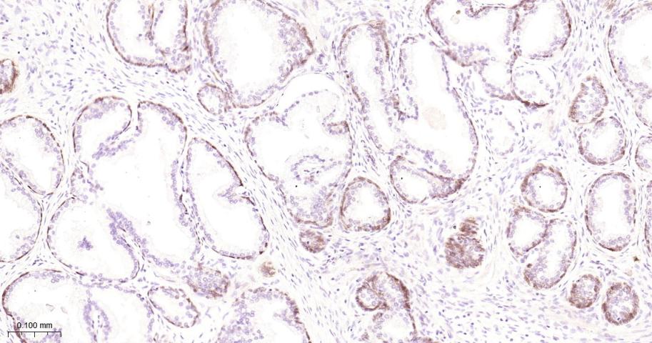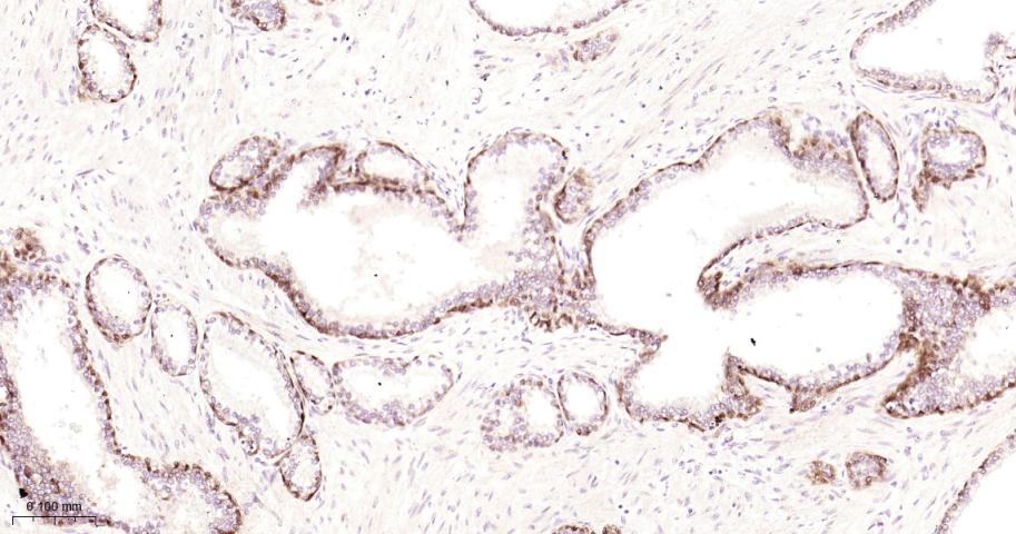 Paraformaldehyde-fixed, paraffin embedded Human Prostate; Antigen retrieval by boiling in sodium citrate buffer (pH6.0) for 15 min; Antibody incubation with COMT Monoclonal Antibody, Unconjugated(bsm-61936R) at 1:200 overnight at 4°C, followed by conjugation to the bs-0295G-HRP and DAB (C-0010) staining.
