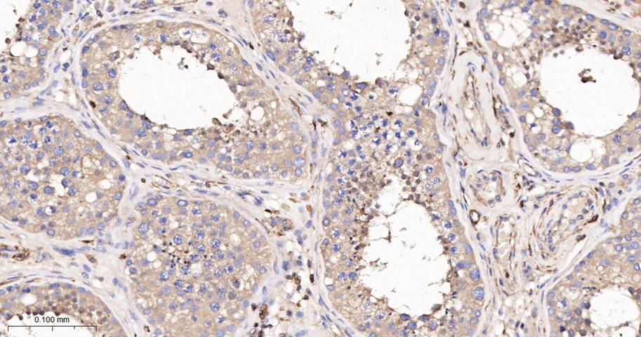 Paraformaldehyde-fixed, paraffin embedded Human Testicles; Antigen retrieval by boiling in sodium citrate buffer (pH6.0) for 15 min; The section was incubated with METAP2 Monoclonal Antibody, Unconjugated (bsm-61939R) at 1:200 overnight at 4°C, followed by conjugation to the bs-0295G-HRP and DAB (C-0010) staining.