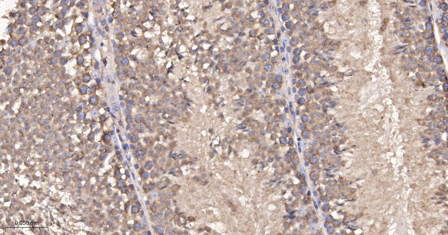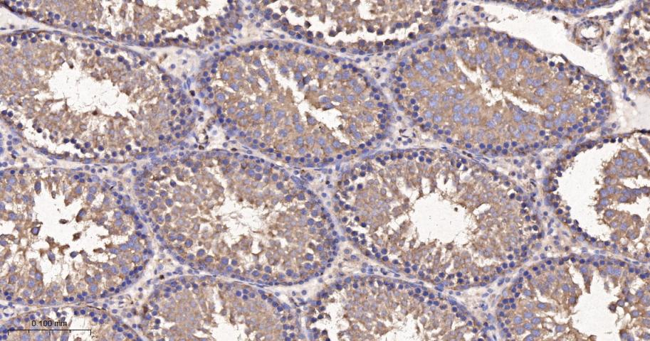 Paraformaldehyde-fixed, paraffin embedded Rat Testicles; Antigen retrieval by boiling in sodium citrate buffer (pH6.0) for 15 min; The section was incubated with METAP2 Monoclonal Antibody, Unconjugated (bsm-61939R) at 1:200 overnight at 4°C, followed by conjugation to the bs-0295G-HRP and DAB (C-0010) staining.