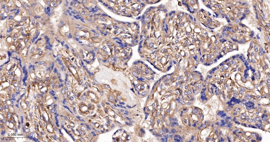 Paraformaldehyde-fixed, paraffin embedded Human Placenta; Antigen retrieval by boiling in sodium citrate buffer (pH6.0) for 15 min; The section was incubated with METAP2 Monoclonal Antibody, Unconjugated (bsm-61939R) at 1:200 overnight at 4°C, followed by conjugation to the bs-0295G-HRP and DAB (C-0010) staining.