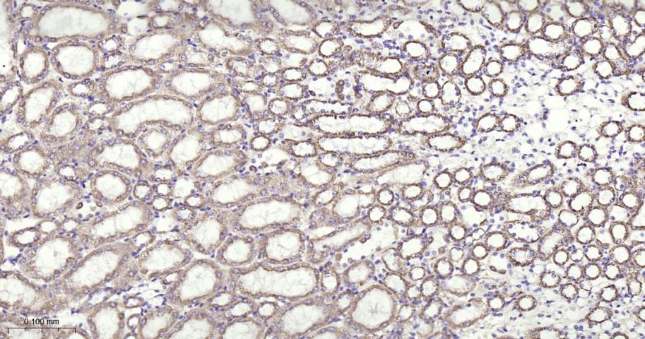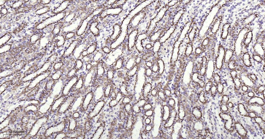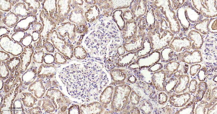 Paraformaldehyde-fixed, paraffin embedded Rat Kidney; Antigen retrieval by boiling in sodium citrate buffer (pH6.0) for 15 min; Antibody incubation with Aconitase 2 Monoclonal Antibody, Unconjugated(bsm-61944R) at 1:200 overnight at 4°C, followed by conjugation to the bs-0295G-HRP and DAB (C-0010) staining.