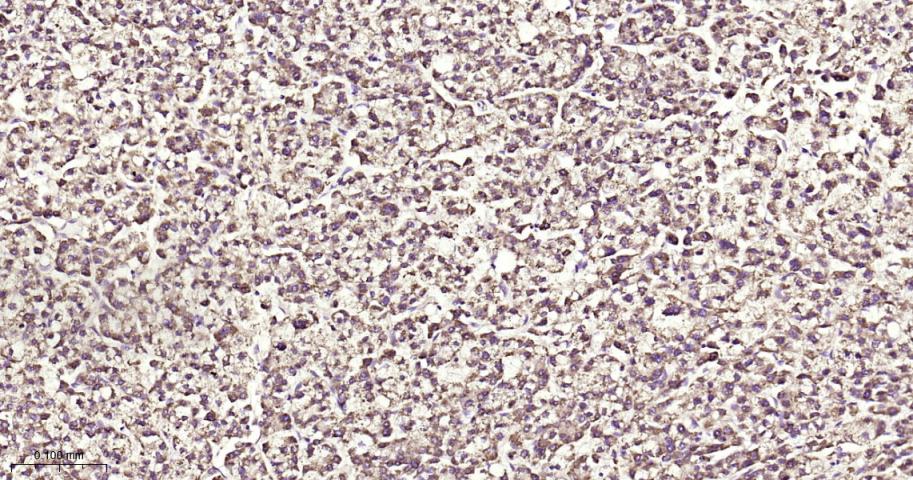 Paraformaldehyde-fixed, paraffin embedded Human Liver Cancer; Antigen retrieval by boiling in sodium citrate buffer (pH6.0) for 15 min; Antibody incubation with Aconitase 2 Monoclonal Antibody, Unconjugated(bsm-61944R) at 1:200 overnight at 4°C, followed by conjugation to the bs-0295G-HRP and DAB (C-0010) staining.