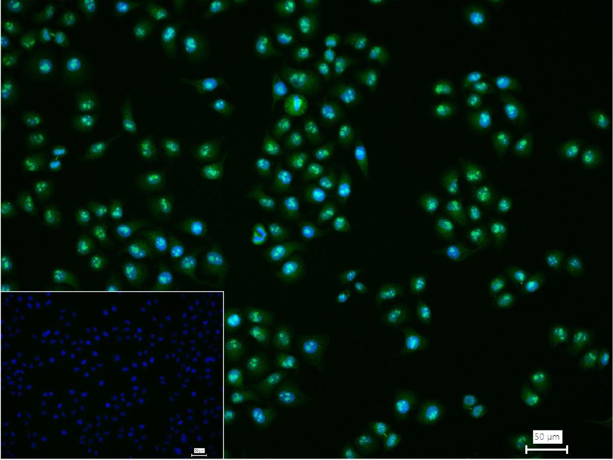 4% Paraformaldehyde-fixed Hela (H) cell; Triton X-100 at r.t. for 20 min; Antibody incubation with (GNL3) monoclonal Antibody, unconjugated (bsm-61946R) 1:100, 90 min at 37°C; followed by conjugated Goat Anti-Rabbit IgG antibody (green, bs-40295G-FITC) at 37°C for 90 min, DAPI (blue, C02-04002) was used to stain the cell nuclei. PBS instead of the primary antibody was used as the blank control.