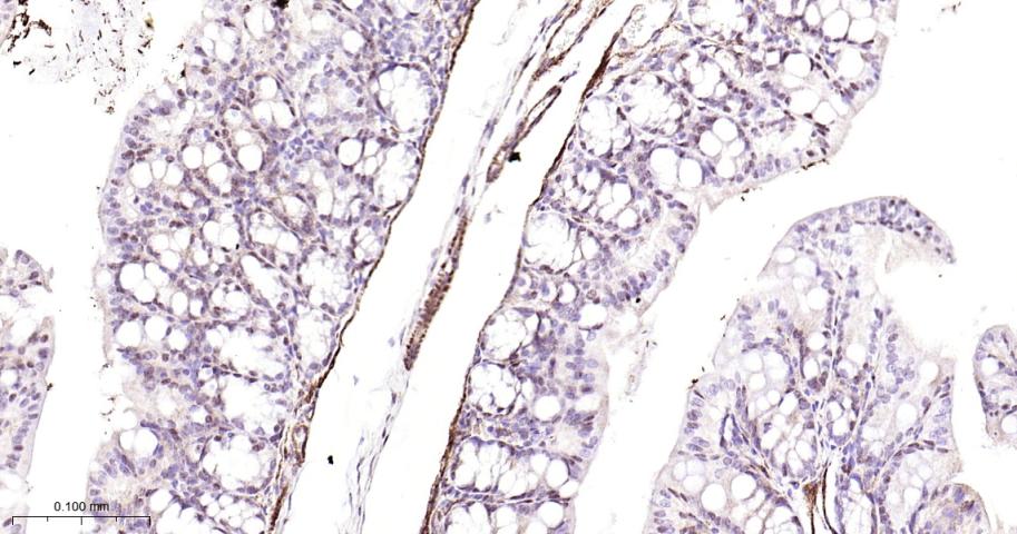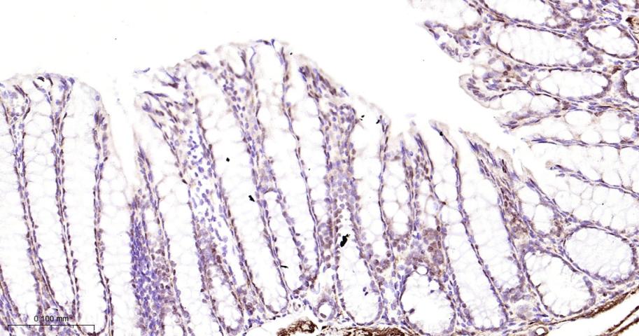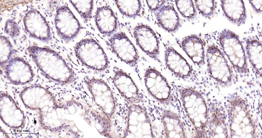 Paraformaldehyde-fixed, paraffin embedded Mouse Colon; Antigen retrieval by boiling in sodium citrate buffer (pH6.0) for 15 min; Antibody incubation with CTBP1 Monoclonal Antibody, Unconjugated(bsm-61953R) at 1:200 overnight at 4°C, followed by conjugation to the bs-0295G-HRP and DAB (C-0010) staining.