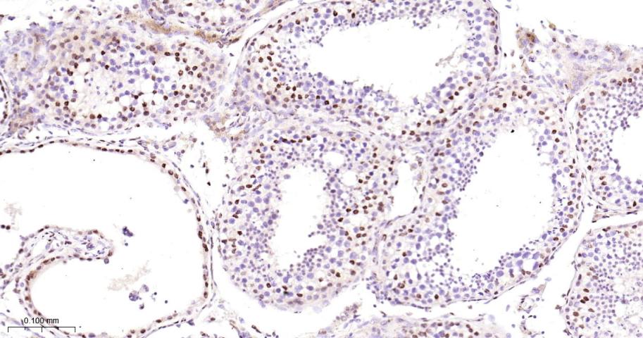 Paraformaldehyde-fixed, paraffin embedded Human Testicles; Antigen retrieval by boiling in sodium citrate buffer (pH6.0) for 15 min; Antibody incubation with CTBP1 Monoclonal Antibody, Unconjugated(bsm-61953R) at 1:200 overnight at 4°C, followed by conjugation to the bs-0295G-HRP and DAB (C-0010) staining.