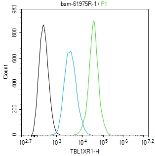 The Hela (H) cells were fixed with 4% PFA (10 min at r.t.) and then permeabilized with 90% ice-cold methanol for 20 min at -20℃,the cells then were incubated in 5%BSA to block non-specific protein-protein interactions (30 min at r.t.).Primary Antibody (green):Rabbit Anti-TBL1XR1 antibody (bsm-61975R,1:50); Secondary Antibody (white blue): Goat anti-Rabbit IgG-BF488 (bs-60295G-BF488): 1 μg/test. Blank control (black): PBS. Acquisition of 20,000 events was performed.