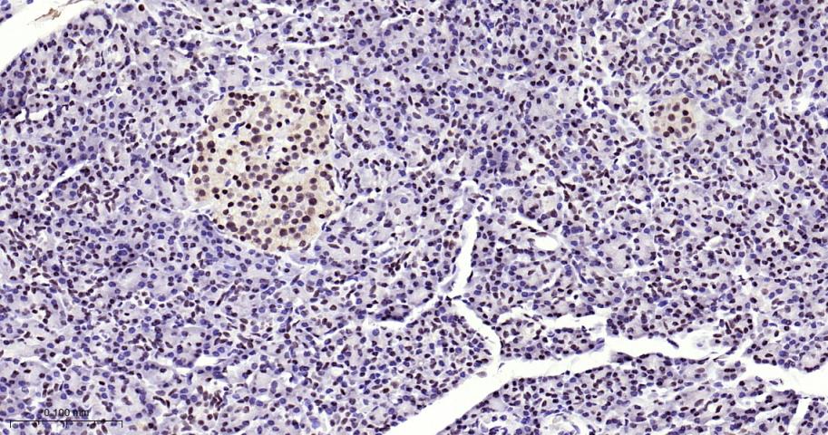 Paraformaldehyde-fixed, paraffin embedded Human Pancreas; Antigen retrieval by boiling in sodium citrate buffer (pH6.0) for 15 min; Antibody incubation with METTL3 Monoclonal Antibody, Unconjugated(bsm-62004R) at 1:200 overnight at 4°C, followed by conjugation to the bs-0295G-HRP and DAB (C-0010) staining.