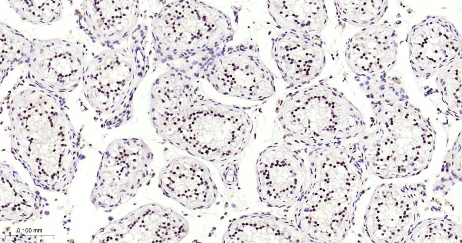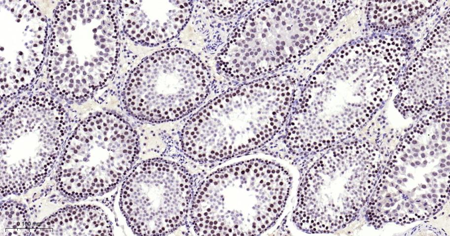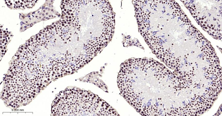 Paraformaldehyde-fixed, paraffin embedded Rat Testicles; Antigen retrieval by boiling in sodium citrate buffer (pH6.0) for 15 min; Antibody incubation with METTL3 Monoclonal Antibody, Unconjugated(bsm-62004R) at 1:200 overnight at 4°C, followed by conjugation to the bs-0295G-HRP and DAB (C-0010) staining.