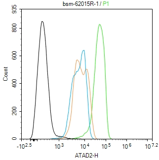 The MCF-7 (H) cells were fixed with 4% PFA (10 min at r.t.) and then permeabilized with 90% ice-cold methanol for 20 min at -20℃,the cells then were incubated in 5%BSA to block non-specific protein-protein interactions (30 min at r.t.).Primary Antibody (green):Rabbit Anti-ATAD2 antibody (bsm-62015R): 1 μg/10^6 cells; Secondary Antibody (white blue): Goat anti-Rabbit IgG-FITC (bs-40295G-FITC): 1 μg/test. Isotype Control (orange): Rabbit IgG (bs-0295P). Blank control (black): PBS. Acquisition of 20,000 events was performed.