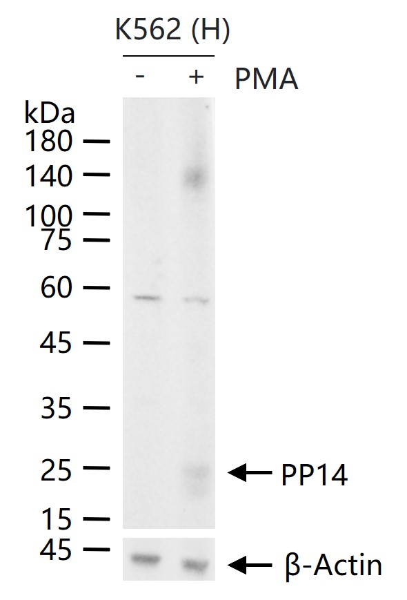 K562 (H) cells were treated with or without PMA (2 ng/ml) for 2 days, 25 μg total protein per lane of cell lysates (see on figure) probed with PP14 monoclonal antibody, unconjugated (bsm-62050R) at 1:1000 dilution and 4°C overnight incubation. Followed by conjugated secondary antibody incubation at r.t. for 60 min.