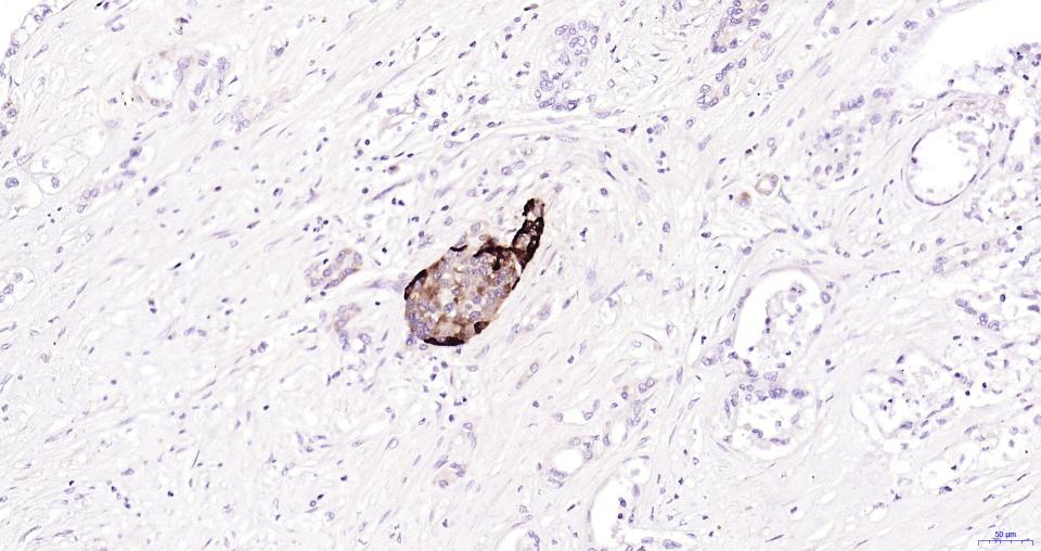 Paraformaldehyde-fixed, paraffin embedded Human pancreatic cancer; Antigen retrieval by boiling in sodium citrate buffer (pH6.0) for 15 min; Antibody incubation with Glucagon Monoclonal Antibody, Unconjugated(bsm-62056R) at 1:200 overnight at 4°C, followed by conjugation to the SP Kit(Rabbit, SP-0023) and DAB (C-0010) staining.
