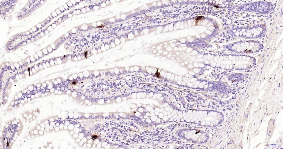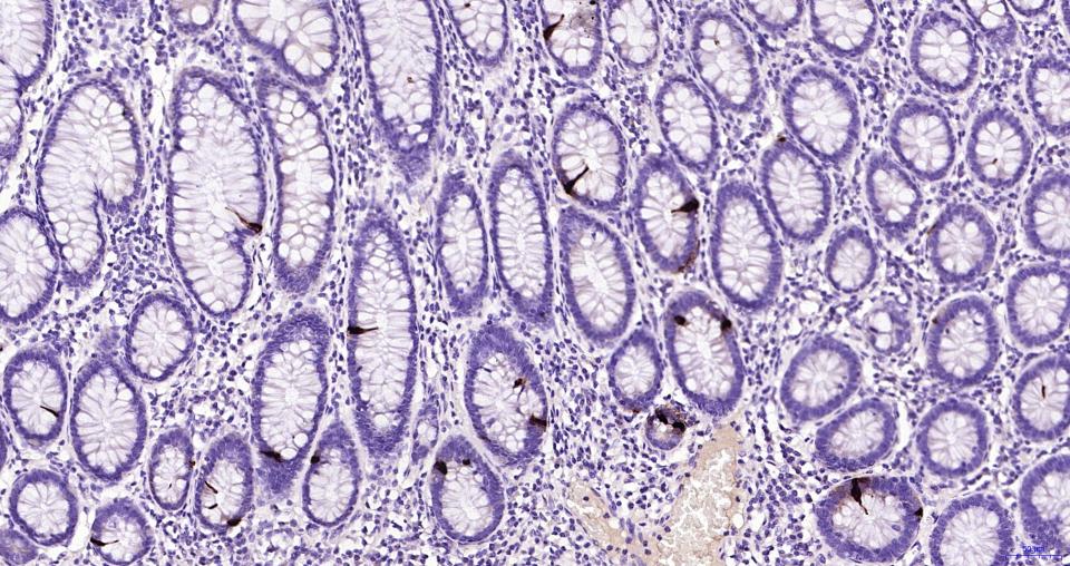 Paraformaldehyde-fixed, paraffin embedded Human colon; Antigen retrieval by boiling in sodium citrate buffer (pH6.0) for 15 min; Antibody incubation with Glucagon Monoclonal Antibody, Unconjugated(bsm-62056R) at 1:200 overnight at 4°C, followed by conjugation to the SP Kit(Rabbit, SP-0023) and DAB (C-0010) staining.