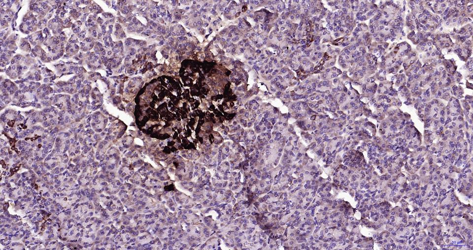 Paraformaldehyde-fixed, paraffin embedded Human pancreas; Antigen retrieval by boiling in sodium citrate buffer (pH6.0) for 15 min; Antibody incubation with Glucagon Monoclonal Antibody, Unconjugated(bsm-62056R) at 1:200 overnight at 4°C, followed by conjugation to the SP Kit(Rabbit, SP-0023) and DAB (C-0010) staining.