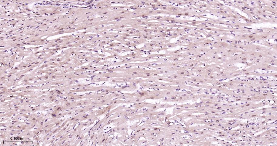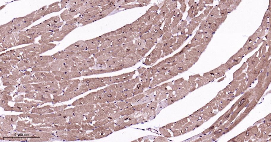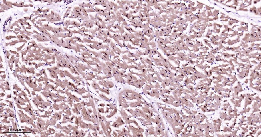 Paraformaldehyde-fixed, paraffin embedded Rat heart; Antigen retrieval by boiling in sodium citrate buffer (pH6.0) for 15 min; The section was incubated with PSMD14 Monoclonal Antibody, Unconjugated(bsm-62064R) at 1:200 overnight at 4°C, followed by conjugation to the bs-0295G-HRP and DAB (C-0010) staining.