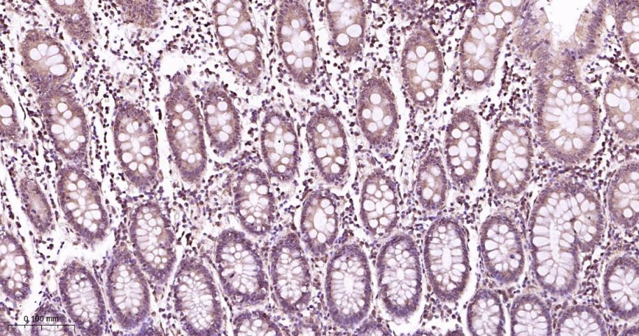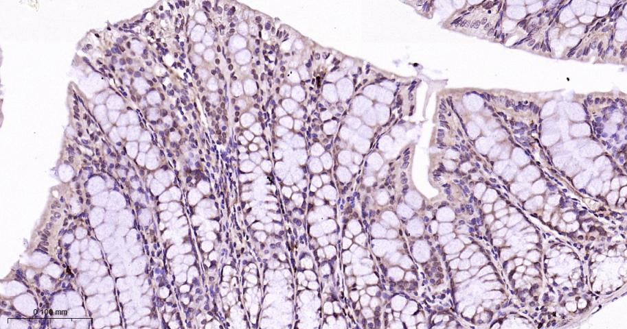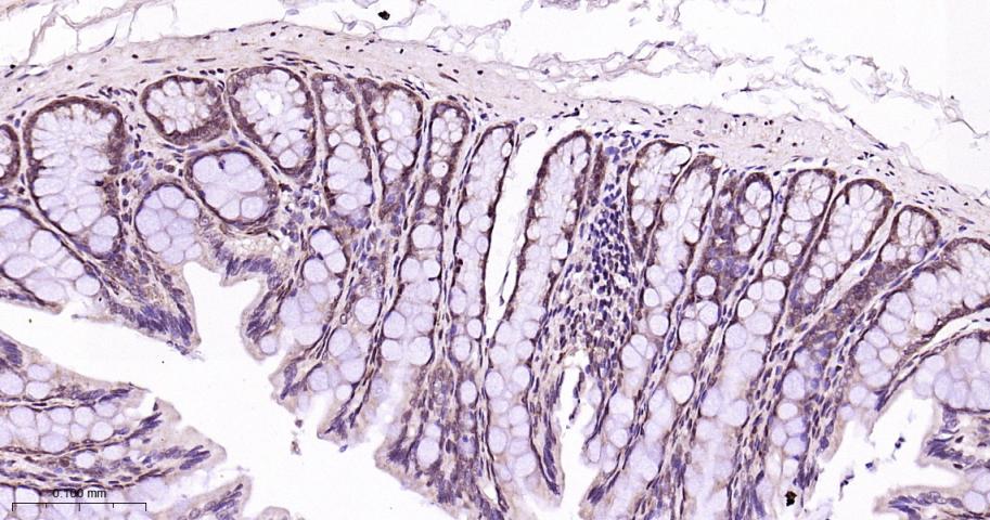 Paraformaldehyde-fixed, paraffin embedded Mouse colon; Antigen retrieval by boiling in sodium citrate buffer (pH6.0) for 15 min; The section was incubated with PSMD14 Monoclonal Antibody, Unconjugated(bsm-62064R) at 1:200 overnight at 4°C, followed by conjugation to the bs-0295G-HRP and DAB (C-0010) staining.