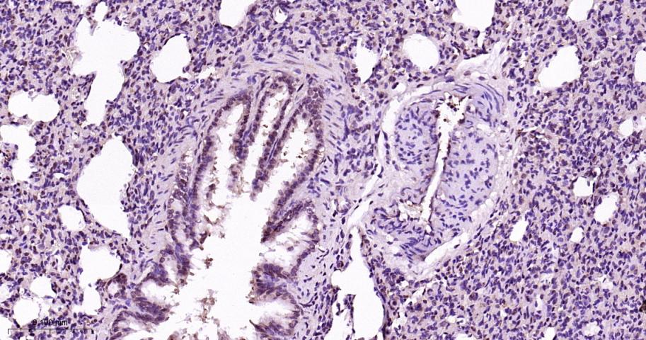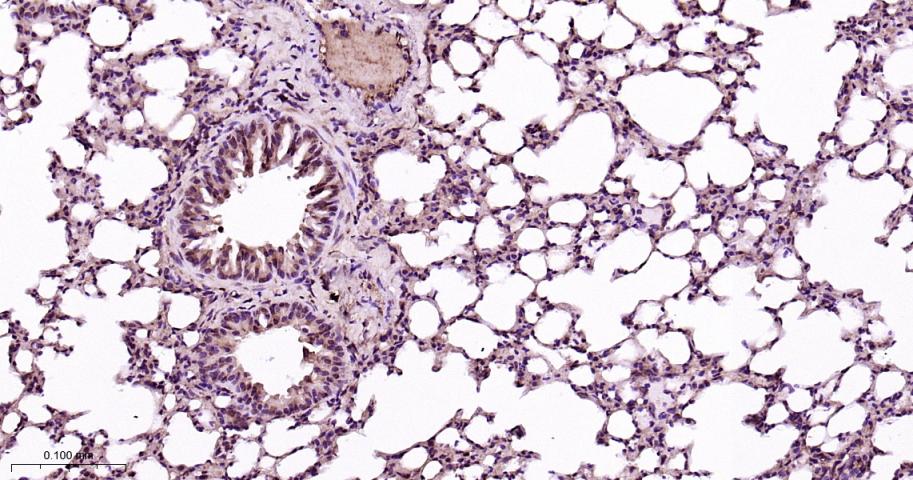 Paraformaldehyde-fixed, paraffin embedded Mouse lung; Antigen retrieval by boiling in sodium citrate buffer (pH6.0) for 15 min; The section was incubated with PSMD14 Monoclonal Antibody, Unconjugated(bsm-62064R) at 1:200 overnight at 4°C, followed by conjugation to the bs-0295G-HRP and DAB (C-0010) staining.