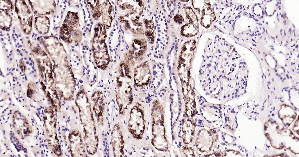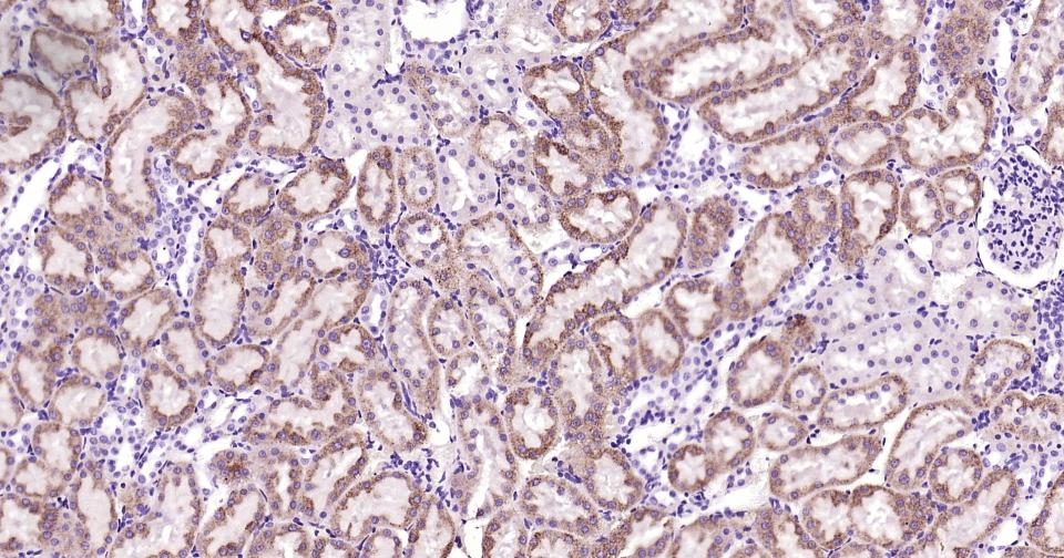 Paraformaldehyde-fixed, paraffin embedded Human Kidney; Antigen retrieval by boiling in sodium citrate buffer (pH6.0) for 15 min; Antibody incubation with ABAT?Monoclonal Antibody, Unconjugated(bsm-62069R) at 1:200 overnight at 4°C, followed by conjugation to the bs-0295G-HRP and DAB (C-0010) staining.