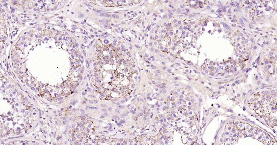 Paraformaldehyde-fixed, paraffin embedded Human Testicles; Antigen retrieval by boiling in sodium citrate buffer (pH6.0) for 15 min; Antibody incubation with ABAT?Monoclonal Antibody, Unconjugated(bsm-62069R) at 1:200 overnight at 4°C, followed by conjugation to the bs-0295G-HRP and DAB (C-0010) staining.