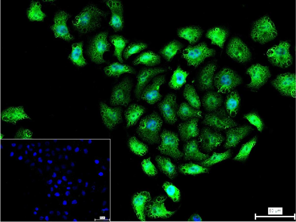 4% Paraformaldehyde-fixed Hela (H) cell; Triton X-100 at r.t. for 20 min; Antibody incubation with (ALYREF) monoclonal Antibody, unconjugated (bsm-62100R) 1:100, 90 min at 37°C; followed by conjugated Goat Anti-Rabbit IgG antibody (green, bs-40295G-FITC) at 37°C for 90 min, DAPI (blue, C02-04002) was used to stain the cell nuclei. PBS instead of the primary antibody was used as the blank control.