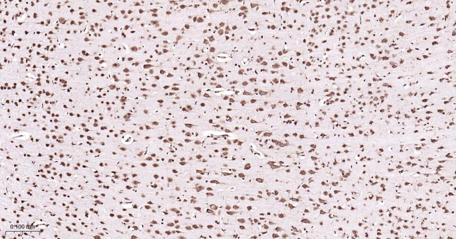 Paraformaldehyde-fixed, paraffin embedded Rat Cerebrum; Antigen retrieval by boiling in sodium citrate buffer (pH6.0) for 15 min; The section was incubated with ALYREF Monoclonal Antibody, Unconjugated (bsm-62100R) at 1:200 overnight at 4°C, followed by conjugation to the bs-0295G-HRP and DAB (C-0010) staining.