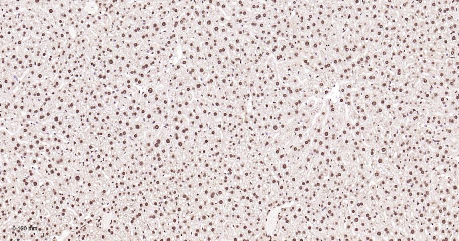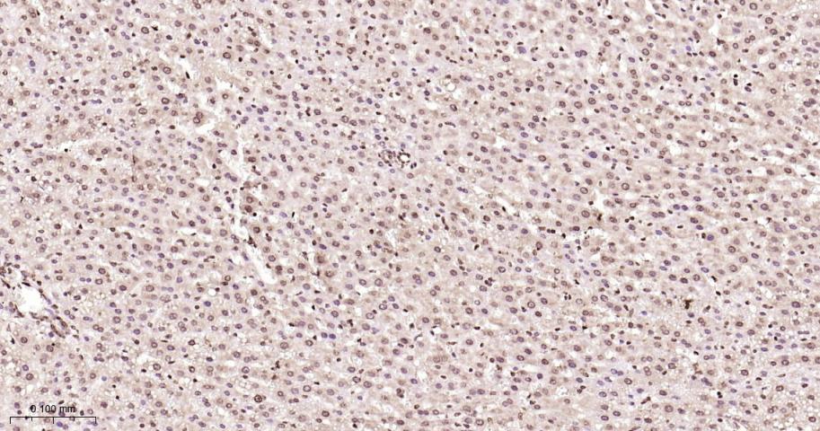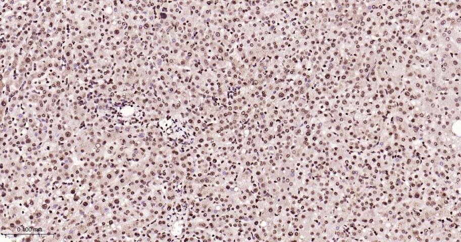 Paraformaldehyde-fixed, paraffin embedded Rat Liver; Antigen retrieval by boiling in sodium citrate buffer (pH6.0) for 15 min; The section was incubated with ALYREF Monoclonal Antibody, Unconjugated (bsm-62100R) at 1:200 overnight at 4°C, followed by conjugation to the bs-0295G-HRP and DAB (C-0010) staining.