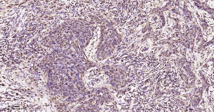 Paraformaldehyde-fixed, paraffin embedded Human Cervical Cancer; Antigen retrieval by boiling in sodium citrate buffer (pH6.0) for 15 min; The section was incubated with ALYREF Monoclonal Antibody, Unconjugated (bsm-62100R) at 1:200 overnight at 4°C, followed by conjugation to the bs-0295G-HRP and DAB (C-0010) staining.