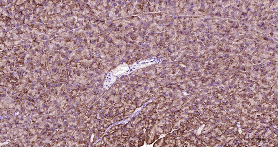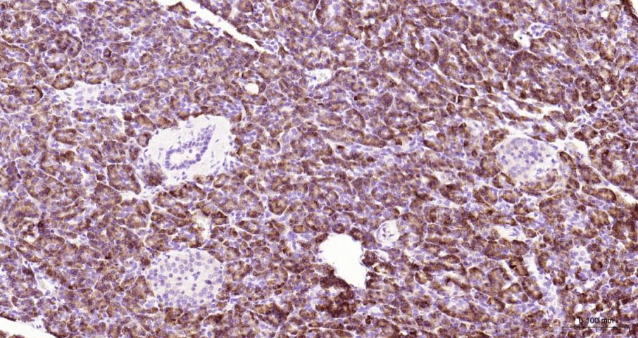 Paraformaldehyde-fixed, paraffin embedded Mouse Pancreas; Antigen retrieval by boiling in sodium citrate buffer (pH6.0) for 15 min; Antibody incubation with PAR-2 Monoclonal Antibody, Unconjugated(bsm-62143R) at 1:200 overnight at 4°C, followed by conjugation to the bs-0295G-HRP and DAB (C-0010) staining.