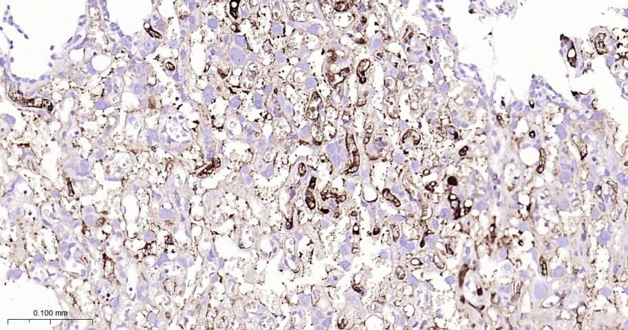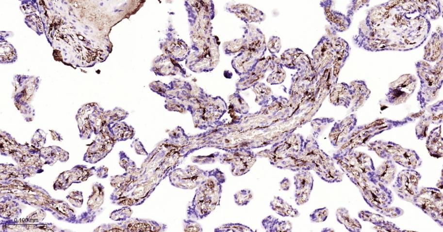 Paraformaldehyde-fixed, paraffin embedded Human Placenta; Antigen retrieval by boiling in sodium citrate buffer (pH6.0) for 15 min; Antibody incubation with Fibrinogen alpha chain Monoclonal Antibody, Unconjugated(bsm-62182R) at 1:100 overnight at 4°C, followed by conjugation to the bs-0295G-HRP and DAB (C-0010) staining.