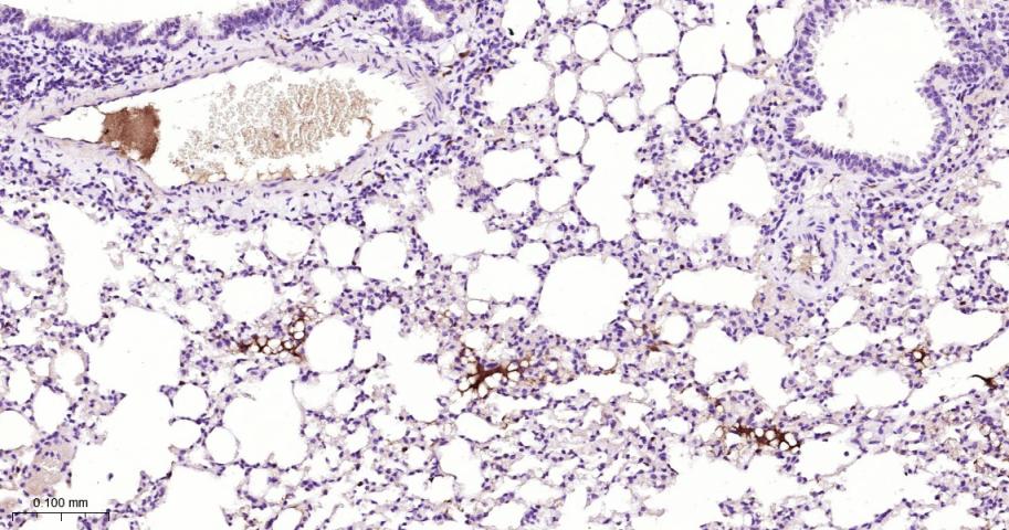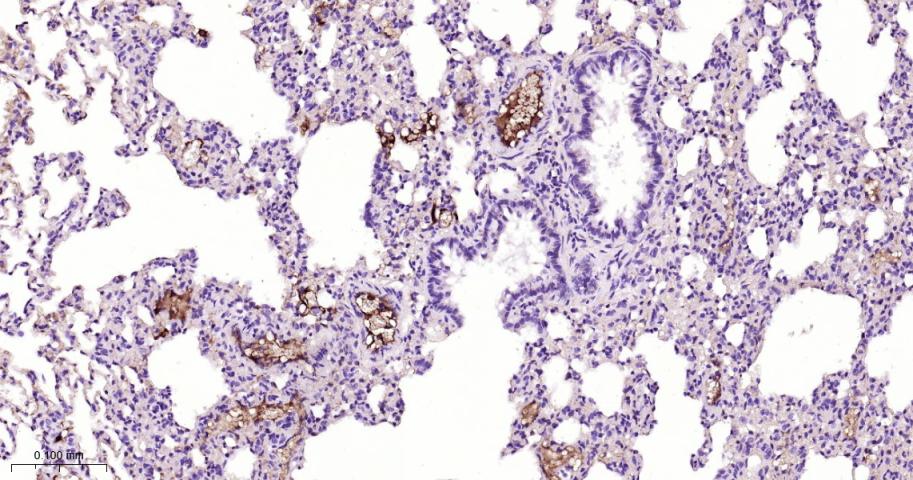 Paraformaldehyde-fixed, paraffin embedded Mouse Lung; Antigen retrieval by boiling in sodium citrate buffer (pH6.0) for 15 min; Antibody incubation with Fibrinogen alpha chain Monoclonal Antibody, Unconjugated(bsm-62182R) at 1:100 overnight at 4°C, followed by conjugation to the bs-0295G-HRP and DAB (C-0010) staining.