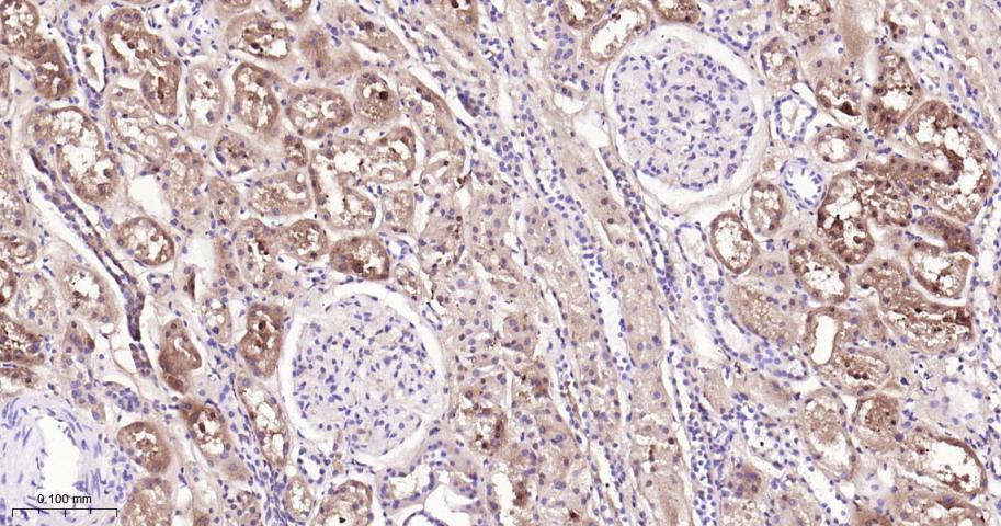 Paraformaldehyde-fixed, paraffin embedded Human Kidney; Antigen retrieval by boiling in sodium citrate buffer (pH6.0) for 15 min; Antibody incubation with Argininosuccinate synthase 1 Monoclonal Antibody, Unconjugated(bsm-62194R) at 1:200 overnight at 4°C, followed by conjugation to the bs-0295G-HRP and DAB (C-0010) staining.